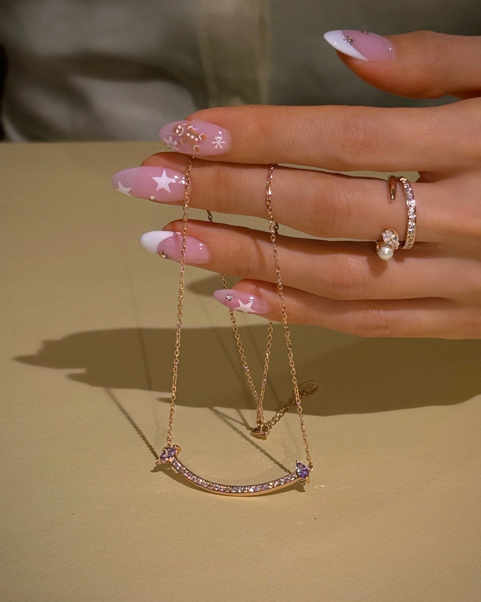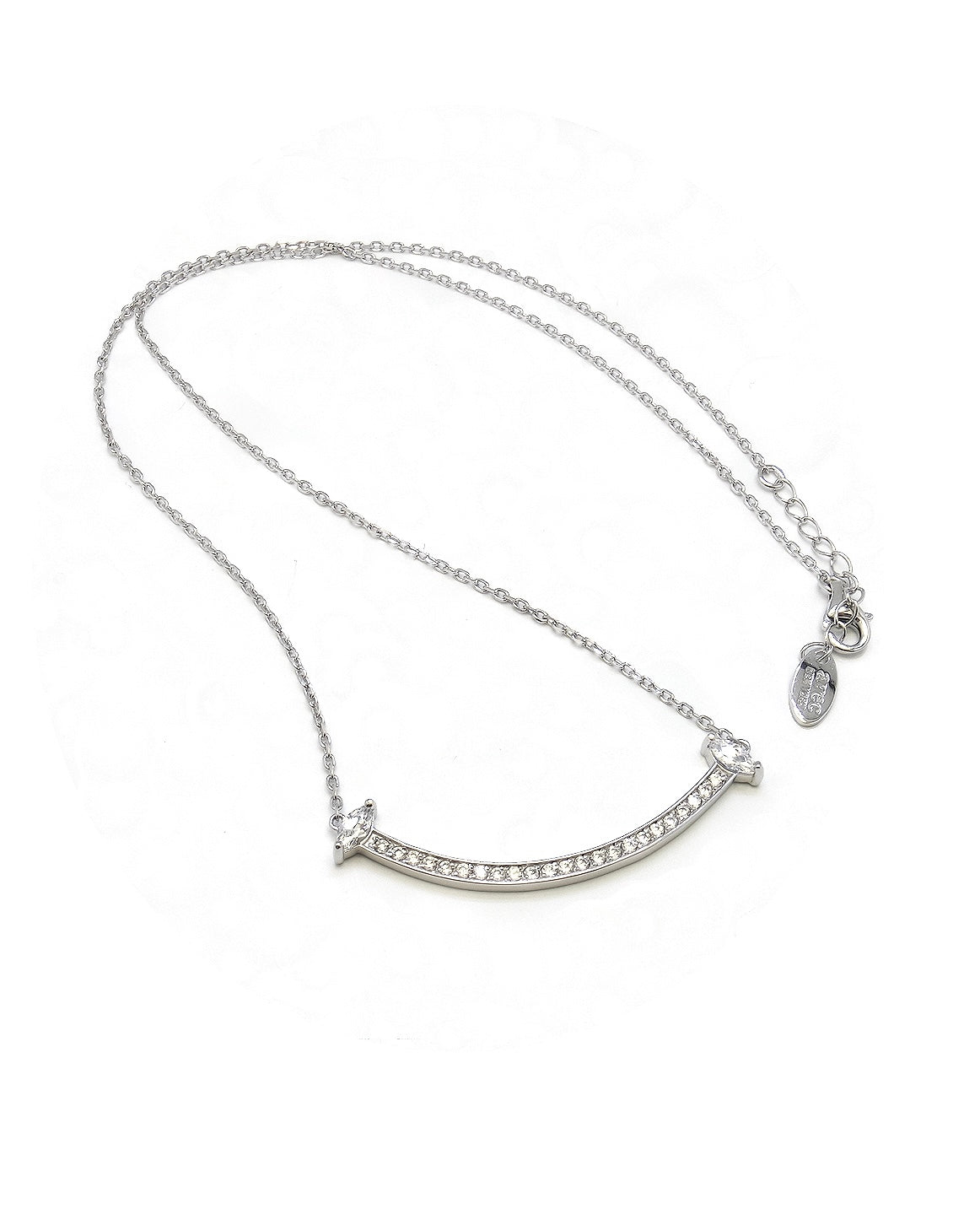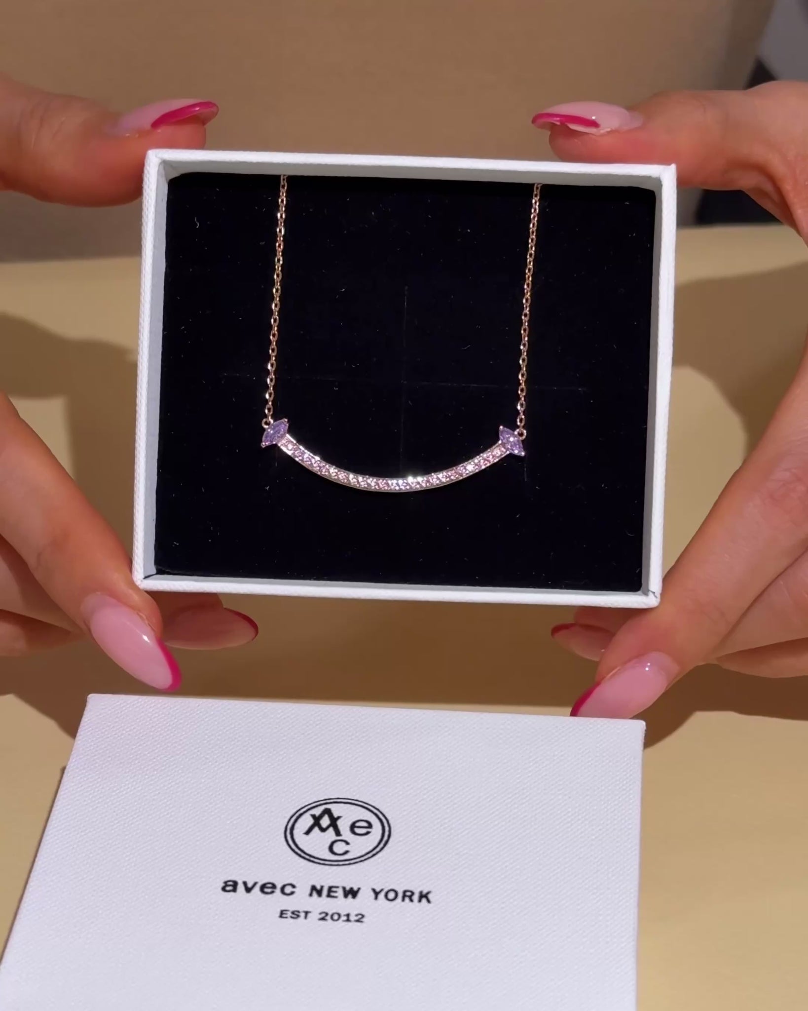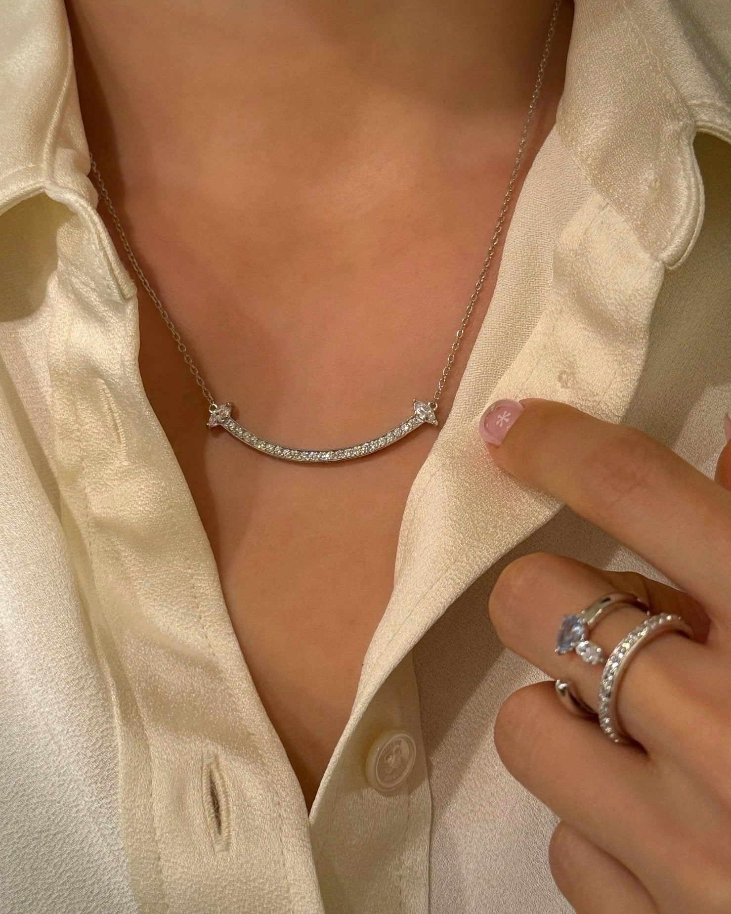 A refined curved bar necklace lined with brilliant pavé stones and finished with sparkling accents at each end. Its soft arc catches the light beautifully, creating an elegant, understated glow. Perfect for everyday wear or as a minimal statement piece layered with your favorites.