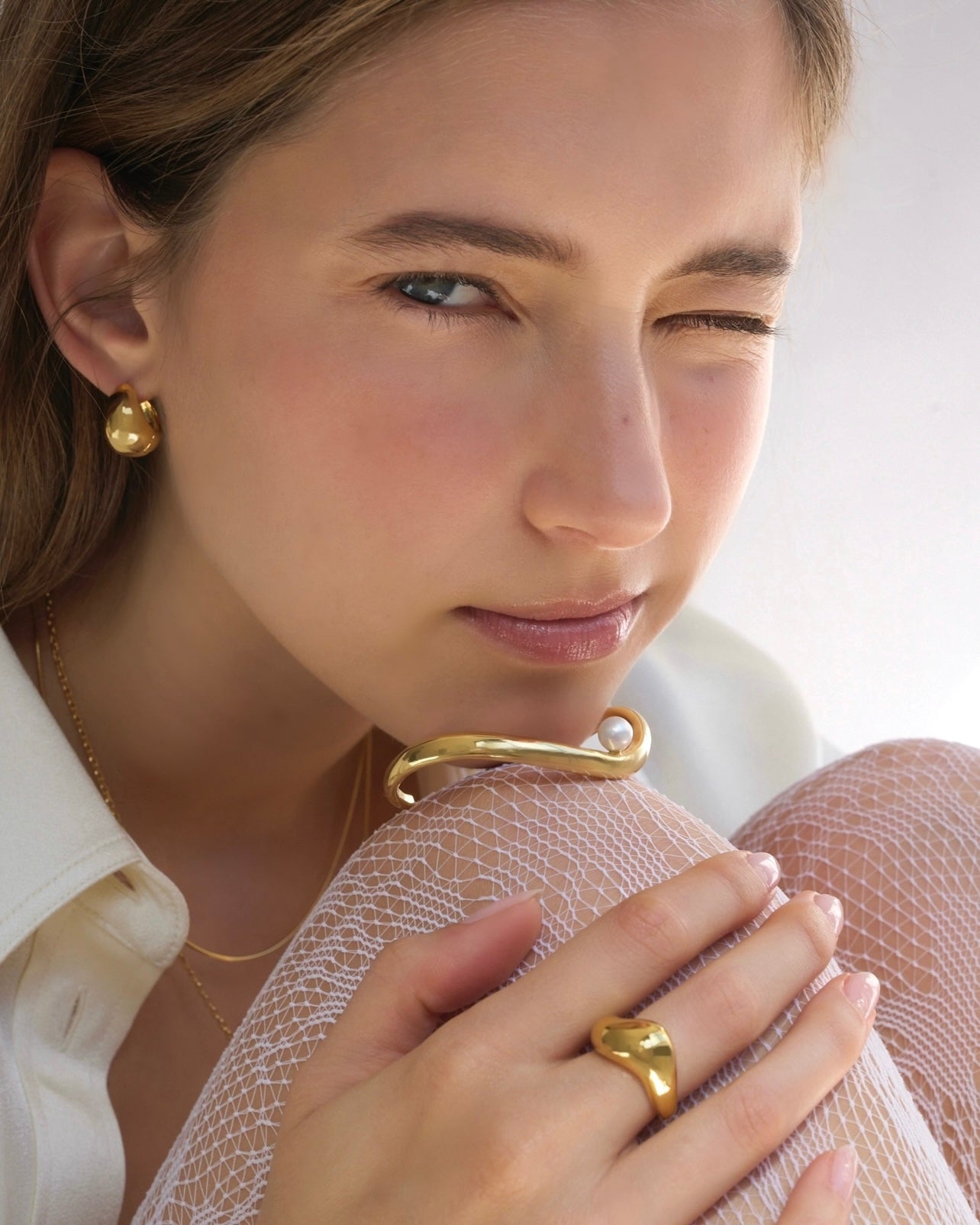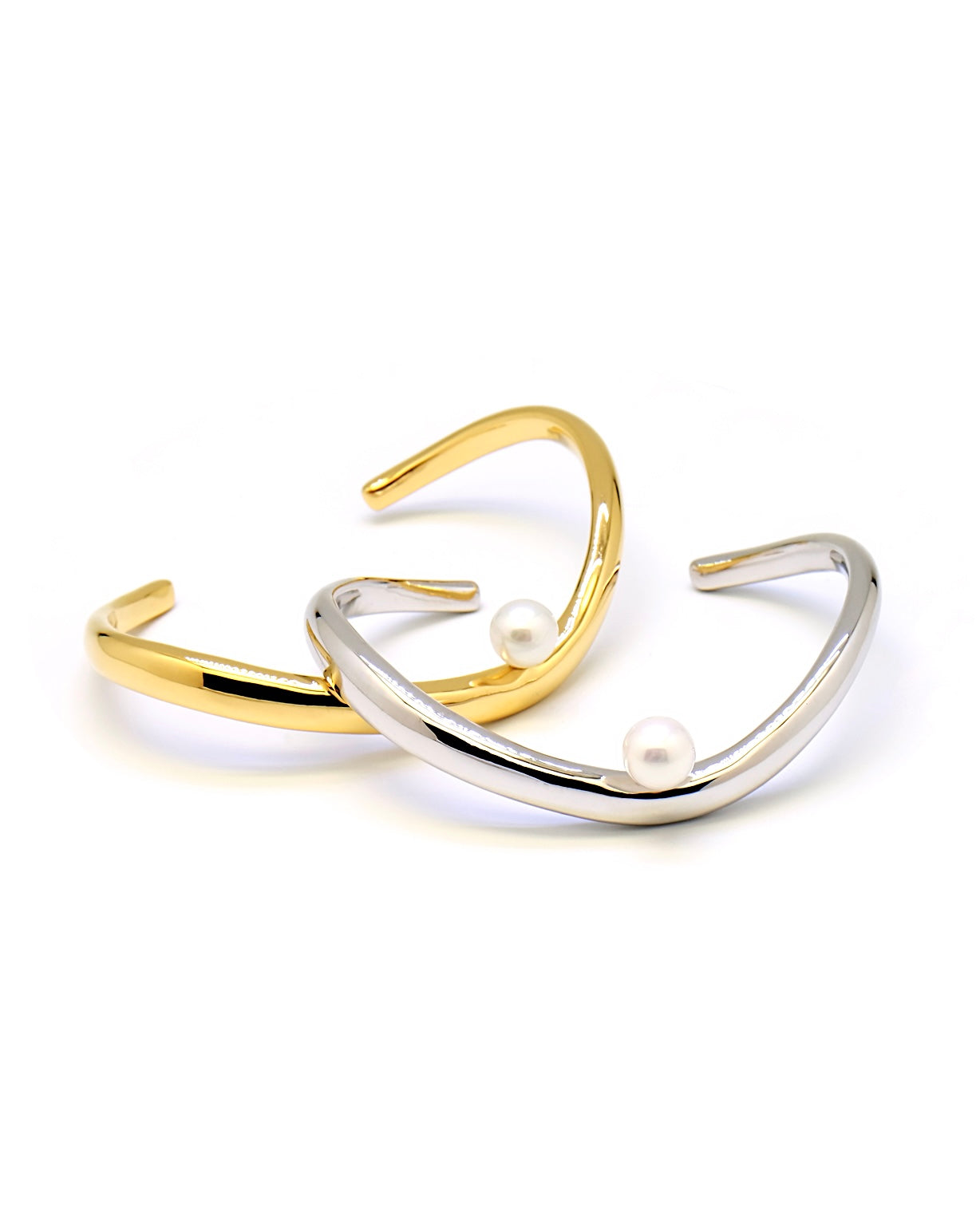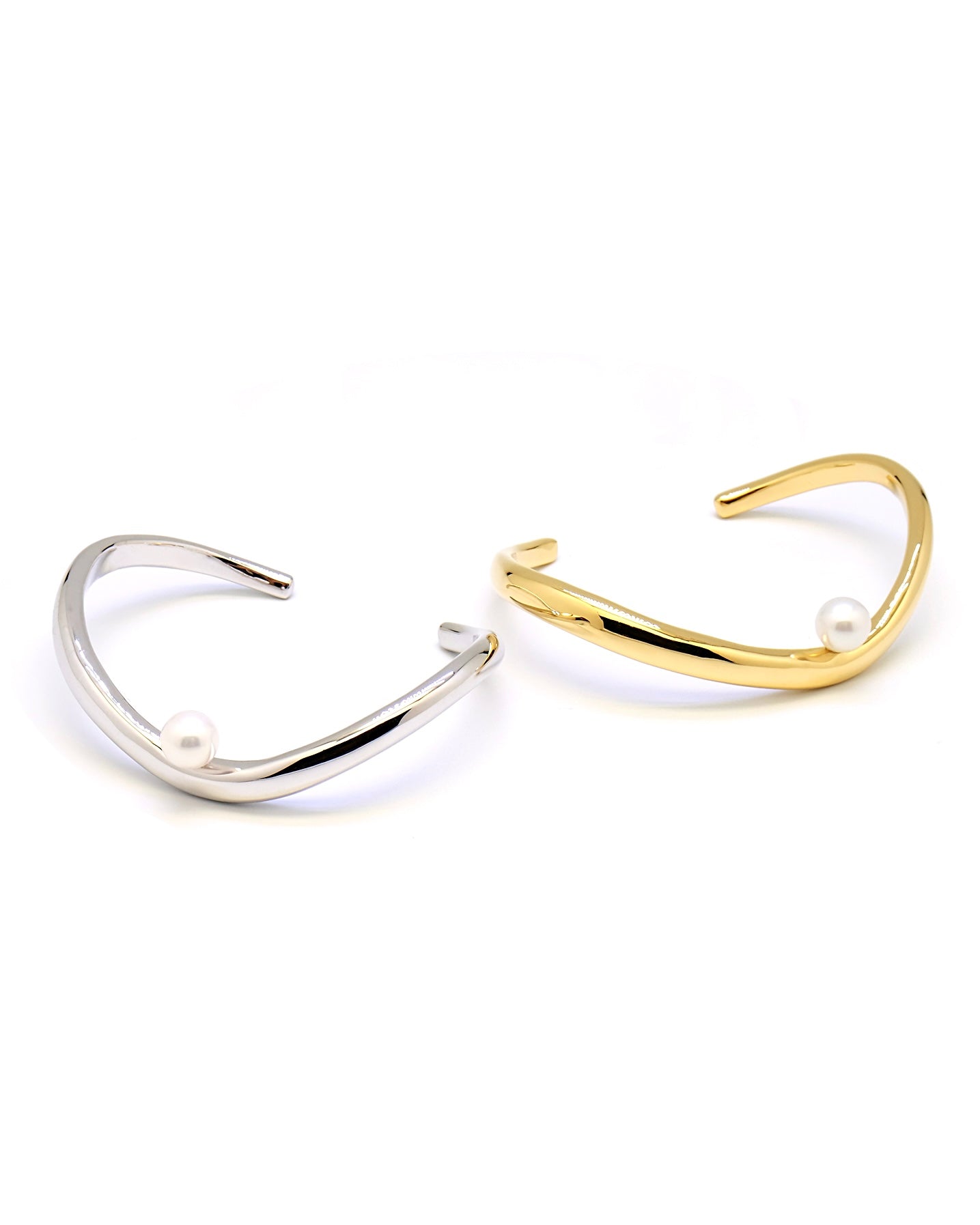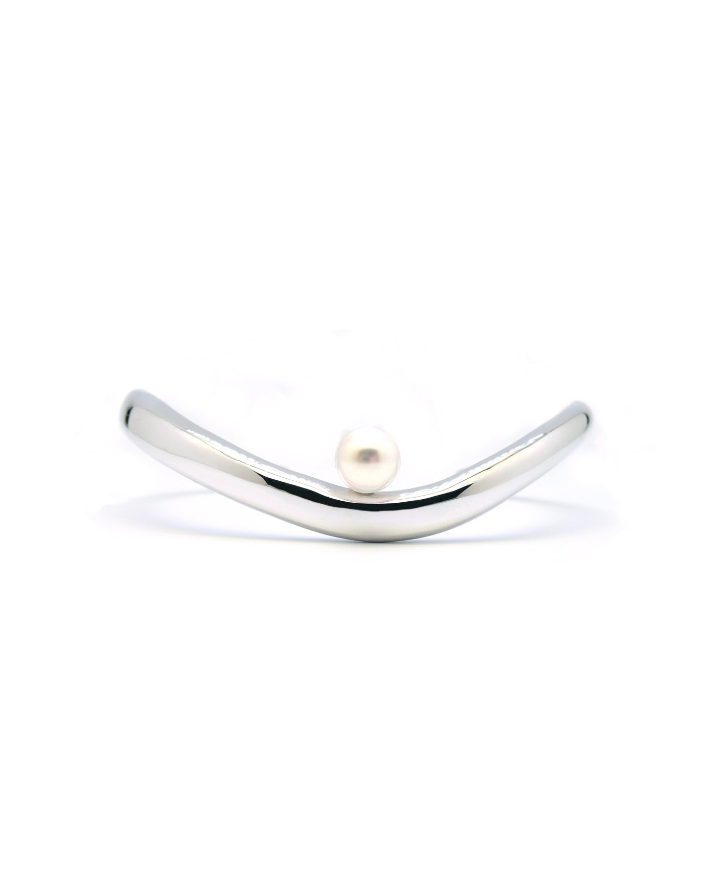 A bold yet refined statement piece. Featuring smooth, flowing curves and a single luminous pearl, this open bangle captures the perfect balance of modern simplicity and classic allure. Nucleus pearl.
